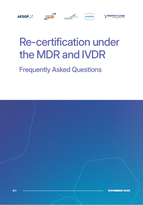 Organizacja MedTech Europe, wspólnie z partnerami branżowymi — AESGP, COCIR, eurom oraz Euromcontact — opublikowała nowy dokument pt. „FAQ on Re-certification”, poświęcony zagadnieniom związanym z procesem recertyfikacji wyrobów medycznych oraz wyrobów do diagnostyki in vitro (IVD) w świetle przepisów MDR i IVDR.